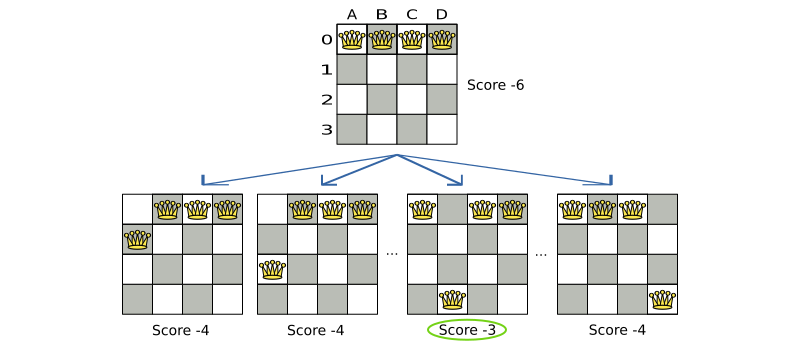 Notice that once a queen has moved, it can be moved again later. This is a good thing, because in an NP-complete problem it’s impossible to predict what will be the optimal final value for a planning variable.